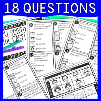 With their 5 Themes of Geography Reading Passage in hand, students will move around the classroom answering questions, playing detective and finding clues to the case. This Text-Marking Detective Mystery has students using their reading passage multiple times searching for evidence to each of the 18 questions. Great addition to your Geography lesson plans.
