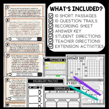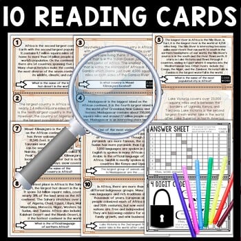 This Continent of Africa Scavenger Hunt lesson is an engaging cross-curricular activity that incorporates reading comprehension, informational text, citing text evidence, movement and critical thinking skills. It also includes an escape room aspect of a final 4-digit numeric code and 4-digit alpha code, leaving your students eager to finish the task. Great introduction to your world geography or continents unit.
