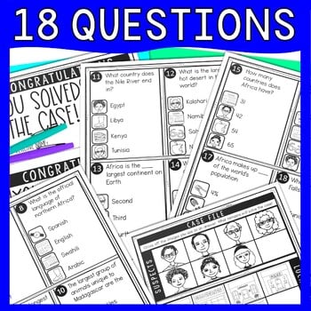 With their Continent of Africa Reading Passage in hand, students will move around the classroom answering questions, playing detective and finding clues to the case. This Text-Marking Detective Mystery has students using their reading passage multiple times searching for evidence to each of the 18 questions. Great addition to your World Geography lesson plans.