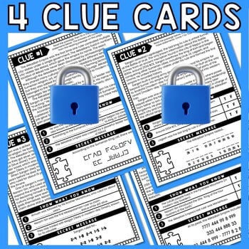 Students will work in pairs (or individually) and race to complete all 4 clue cards. A friendly competition always increases engagement. As students progress through the escape room, they will earn clues to determine the final 4-digit code. The final code is also a puzzle! In order to escape students must present correct answers for EVERY question as well as the decoded secret messages and final 4-digit code.