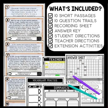 This Alexander Hamilton Scavenger Hunt lesson is an engaging cross-curricular gallery walk activity that incorporates reading comprehension, informational text, citing text evidence, movement and critical thinking skills. It also includes an escape room aspect of a final mystery word and secret 4-digit code, leaving your students eager to finish the task. Great introduction to your Founding Fathers or Revolutionary War unit.