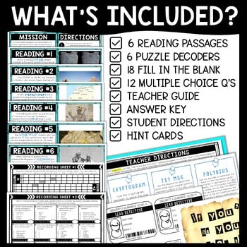 To ensure students don’t just solve the puzzles without reading, there is a second answer recording sheet that requires them to find and cite text evidence. On this page, students will answer 12 multiple choice questions AND indicate where they found the answer (which reading passage #). Students will use reading comprehension skills to read the 6 short passages, determine the missing words, and answer multiple choice questions (citing text evidence). In the end, there are two objectives: 1) Unscramble a mystery word and 2) Determine a 4-digit code.