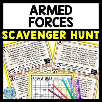 This Armed Forces (US Military) Scavenger Hunt lesson is an engaging cross-curricular gallery walk activity that incorporates reading comprehension, informational text, citing text evidence, movement and critical thinking skills. It also includes an escape room aspect of a final mystery word and secret 4-digit code, leaving your students eager to finish the task. Great introduction to your government unit or Armed Forces Day.