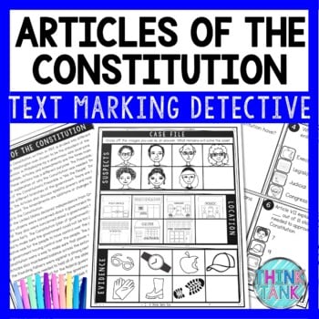 With their Articles of the U.S. Constitution Reading Passage in hand, students will move around the classroom answering questions, playing detective and finding clues to the case. This Text-Marking Detective Mystery has students using their reading passage multiple times searching for evidence to each of the 18 questions.