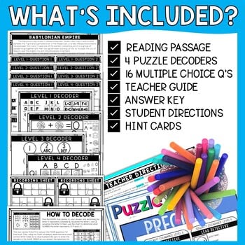 The Babylonian Empire Task Card Escape Room gives students a chance to practice reading comprehension skills and decode puzzles, all while actively learning! With their reading passage in hand, students will move around the classroom and visit 16 task cards. The task cards are broken down into 4 levels or puzzle types. This reading comprehension activity covers the following topics: Babylonian Empire, Hammurabi, rise and fall of the empire. Great addition to your Ancient Mesopotamia unit.