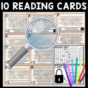 This Charlemagne (Middle Ages) Scavenger Hunt lesson is an engaging cross-curricular gallery walk activity that incorporates reading comprehension, informational text, citing text evidence, movement and critical thinking skills. It also includes an escape room aspect of a final mystery word and secret 4-digit code, leaving your students eager to finish the task. Great introduction to your Middle Ages unit.