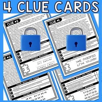 Students will work in pairs (or individually) and race to complete all 4 clue cards. A friendly competition always increases engagement. As students progress through the escape room, they will earn clues to determine the final 4-digit code. The final code is also a puzzle! In order to escape students must present correct answers for EVERY question as well as the decoded secret messages and final 4-digit code.