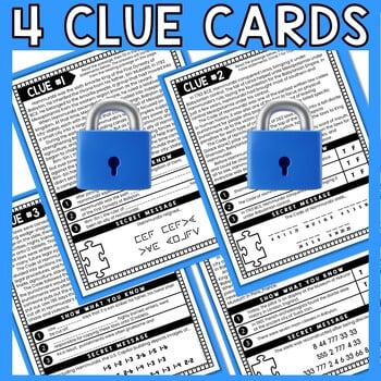 Students will work in pairs (or individually) and race to complete all 4 clue cards. A friendly competition always increases engagement. As students progress through the escape room, they will earn clues to determine the final 4-digit code. The final code is also a puzzle! In order to escape students must present correct answers for EVERY question as well as the decoded secret messages and final 4-digit code.