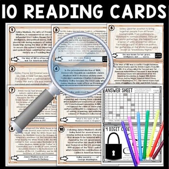 This Dolley Madison Scavenger Hunt lesson is an engaging cross-curricular gallery walk activity that incorporates reading comprehension, informational text, citing text evidence, movement and critical thinking skills. It also includes an escape room aspect of a final mystery word and secret 4-digit code, leaving your students eager to finish the task.