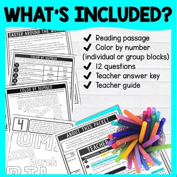Practice reading comprehension skills with this Easter Around the World Color by Number Close Reading Activity. Students will examine the non-fiction, informational text multiple times. This activity includes TWO options for students (individual coloring page or group collaborative poster). This product is NOT religious.