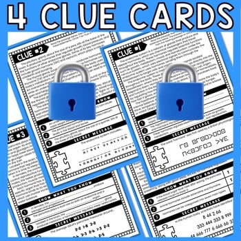 Students will work in pairs (or individually) and race to complete all 4 clue cards. A friendly competition always increases engagement. As students progress through the escape room, they will earn clues to determine the final 4-digit code. The final code is also a puzzle! In order to escape students must present correct answers for EVERY question as well as the decoded secret messages and final 4-digit code.