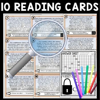This First Amendment (Bill of Rights) Scavenger Hunt lesson is an engaging cross-curricular gallery walk activity that incorporates reading comprehension, informational text, citing text evidence, movement and critical thinking skills. It also includes an escape room aspect of a final mystery word and secret 4-digit code, leaving your students eager to finish the task.