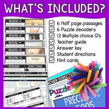Students will work in pairs (or individually) and race to complete 6 puzzles. A friendly competition always increases engagement. Students will use reading comprehension skills to complete the 6 short passages, 12 multiple choice questions and 6 puzzle phrases.