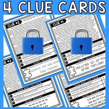Students will work in pairs (or individually) and race to complete all 4 clue cards. A friendly competition always increases engagement. As students progress through the escape room, they will earn clues to determine the final 4-digit code. The final code is also a puzzle! In order to escape students must present correct answers for EVERY question as well as the decoded secret messages and final 4-digit code.