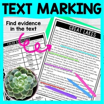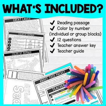 Practice reading comprehension skills with this Great Lakes Color by Number Close Reading Activity. Students will examine the non-fiction, informational text multiple times. This activity includes TWO options for students (individual coloring page or group collaborative poster). Great addition to your geography lesson plans.