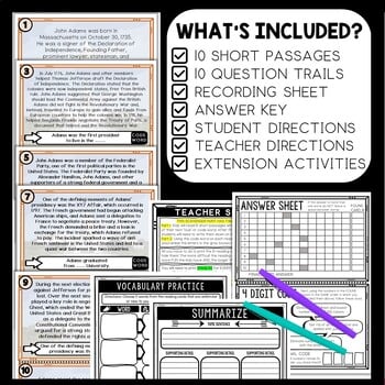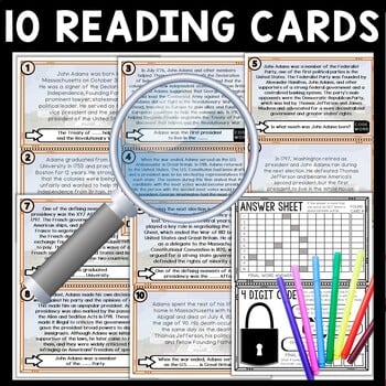 This John Adams Scavenger Hunt lesson is an engaging cross-curricular gallery walk activity that incorporates reading comprehension, informational text, citing text evidence, movement and critical thinking skills. It also includes an escape room aspect of a final mystery word and secret 4-digit code, leaving your students eager to finish the task. Great introduction to your Founding Fathers unit.