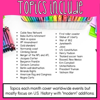 Students may complete these pages independently, in pairs, in small groups, or as a whole class. Use the ‘one-page headlines that made history’ articles to establish routine and allow students to complete each day as they walk in your classroom. Topics each month cover world-wide events but mostly focus on U.S. History with “modern” additions. You could also use this resource to set up reading centers, gallery walks, or prompt a whole class discussion. SO MANY POSSIBILITIES!