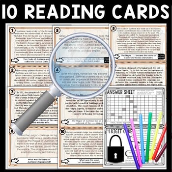 This Justinian I (Byzantine Empire) Scavenger Hunt lesson is an engaging cross-curricular gallery walk activity that incorporates reading comprehension, informational text, citing text evidence, movement and critical thinking skills. It also includes an escape room aspect of a final mystery word and secret 4-digit code, leaving your students eager to finish the task. Great introduction to your Middle Ages unit.