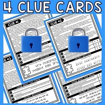 Students will work in pairs (or individually) and race to complete all 4 clue cards. A friendly competition always increases engagement. As students progress through the escape room, they will earn clues to determine the final 4-digit code. The final code is also a puzzle! In order to escape students must present correct answers for EVERY question as well as the decoded secret messages and final 4-digit code.