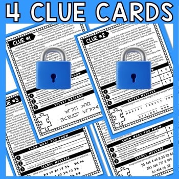 Students will work in pairs (or individually) and race to complete all 4 clue cards. A friendly competition always increases engagement. As students progress through the escape room, they will earn clues to determine the final 4-digit code. The final code is also a puzzle! In order to escape students must present correct answers for EVERY question as well as the decoded secret messages and final 4-digit code.