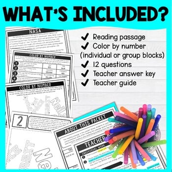 Practice reading comprehension skills with this NASA Color by Number Close Reading Activity. Students will examine the non-fiction, informational text multiple times. This activity includes TWO options for students (individual coloring page or group collaborative poster).