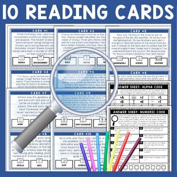 No more boring reading passages where students are stuck at their desk turning textbook pages! Students will move around the classroom visiting TEN reading cards, reading short passages, finding text evidence and answering 10 questions. Each question has an image answer that indicates a specific LETTER of the alphabet.
