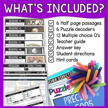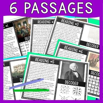 The Presidents 1-10 Fun Facts Reading Comprehension and Puzzle Escape Room gives students a chance to decode puzzles and read passages, all while actively learning! This reading and puzzle activity covers the following topics: interesting facts about U.S. Presidents 1-10, Washington, Jefferson, Constitution, Declaration of Independence, nicknames, presidential firsts, etc.