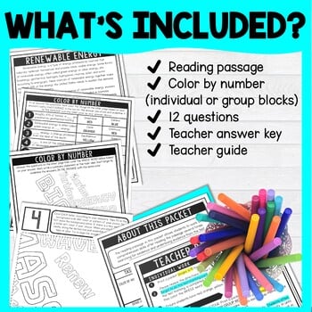 Practice reading comprehension skills with this Renewable Energy Color by Number Close Reading Activity. Students will examine the non-fiction, informational text multiple times. This activity includes TWO options for students (individual coloring page or group collaborative poster).