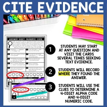Students will revisit the non-fiction text multiple times practicing reading comprehension skills as they rotate around the room seeking text evidence. To ensure understanding of the subject matter, students will answer questions that MUST be found directly in the reading passages. No prior knowledge is needed.