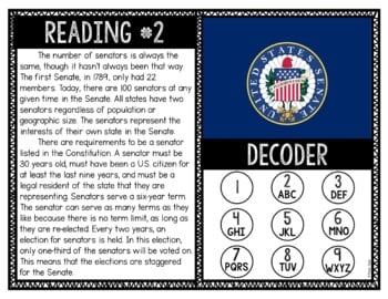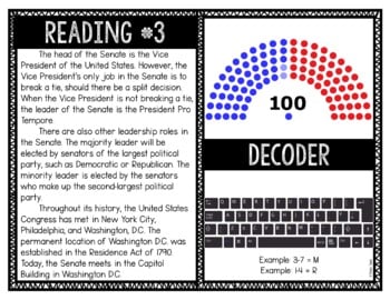 The U.S. Senate Reading and Puzzle Escape gives students a chance to decode puzzles and read passages, all while actively learning! This reading and puzzle activity covers the following topics: Legislative Branch, Congress, Senate, Upper House, US Constitution. Students will practice reading comprehension and critical thinking skills as they rotate around the room solving puzzles. Great addition to your Branches of Government unit.
