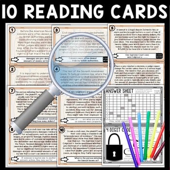 This Seventh Amendment (Bill of Rights) Scavenger Hunt lesson is an engaging cross-curricular gallery walk activity that incorporates reading comprehension, informational text, citing text evidence, movement and critical thinking skills. It also includes an escape room aspect of a final mystery word and secret 4-digit code, leaving your students eager to finish the task. Great introduction to your U.S. Constitution unit.
