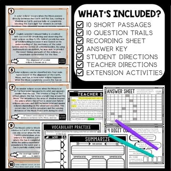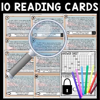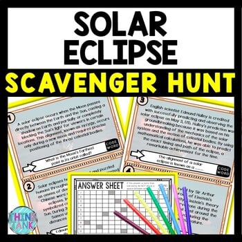 This Solar Eclipse Scavenger Hunt lesson is an engaging cross-curricular gallery walk activity that incorporates reading comprehension, informational text, citing text evidence, movement and critical thinking skills. It also includes an escape room aspect of a final mystery word and secret 4-digit code, leaving your students eager to finish the task. Great introduction to your Solar System unit.