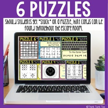How do Digital Escape Rooms work? All you need to do is send students the link! This digital escape room has students working through SIX rooms with a 360° view. Each “room” has hidden icons that lead to a reading passage, puzzle hint, and puzzle to decode. Students will answer questions for each reading passage, then use the decoder to determine the puzzle answer. Drag the mouse or keypad to move the screen for a 360° view! Please note: You will not be able to collect scores or data since this is a self-checking, digital activity.