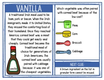 Theย St. Patrickโs Dayย Scavenger Hunt Challenge allows students to move around the classroom while reading passages and answering questions. The activity is structured as a cake bake-off where students determine the missing ingredients of a recipe. You can use theย St. Patrickโs Dayย activity as an introduction or review activity. Theย St. Patrickโs Dayย Activity is designed so that students must visit each of the 14 Ingredient Cards and piece together the recipe to win the great cake bake-off! Each Ingredient Card contains a short reading passage about the topic, a multiple-choice question and a clue. Students will get โcluesโ for which Ingredient Card they should visit next. No more boring worksheets!
