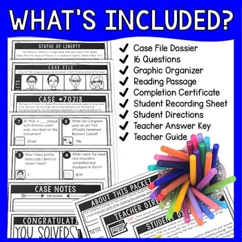 With their Statue of Liberty Reading Passage in hand, students will move around the classroom answering questions, playing detective and finding clues to the case. This Text-Marking Detective Mystery has students using their reading passage multiple times searching for evidence to each of the 18 questions.