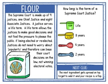 The Supreme Court Scavenger Hunt Challenge allows students to move around the classroom while reading passages and answering questions. Great addition to your U.S. Constitution or Branches of Government unit. The activity is structured as a cake bake-off where students determine the missing ingredients of a recipe. You can use the Supreme Court activity as an introduction or review activity. The Supreme Court activity is designed so that students must visit each of the 14 Ingredient Cards and piece together the recipe to win the great cake bake-off! Each Ingredient Card contains a short reading passage about the topic, a multiple-choice question and a clue. Students will get “clues” for which Ingredient Card they should visit next. No more boring worksheets!