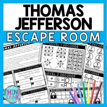 The Thomas Jefferson Task Card Escape Room gives students a chance to practice reading comprehension skills and decode puzzles, all while actively learning! With their reading passage in hand, students will move around the classroom and visit 16 task cards. The task cards are broken down into 4 levels or puzzle types. This reading comprehension activity covers the following topics: Thomas Jefferson, Revolutionary War, Declaration of Independence, Louisiana Purchase, president.