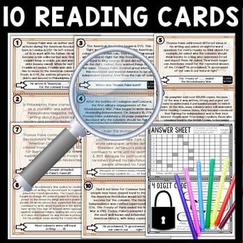 This Thomas Paine (Revolutionary War) Scavenger Hunt lesson is an engaging cross-curricular gallery walk activity that incorporates reading comprehension, informational text, citing text evidence, movement and critical thinking skills. It also includes an escape room aspect of a final mystery word and secret 4-digit code, leaving your students eager to finish the task. Great introduction to your Revolutionary War unit.