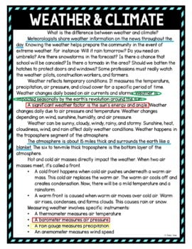 Students complete a โbefore readingโ anticipation guide, read aboutย Weather & Climate, answers questions, mark the text for evidence, color the picture according to their answer, and complete the โafter readingโ anticipation guide.