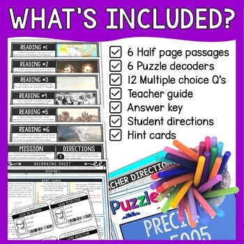 Students will work in pairs (or individually) and race to complete 6 puzzles. A friendly competition always increases engagement. Students will use reading comprehension skills to complete the 6 short passages, 12 multiple choice questions and 6 puzzle phrases.