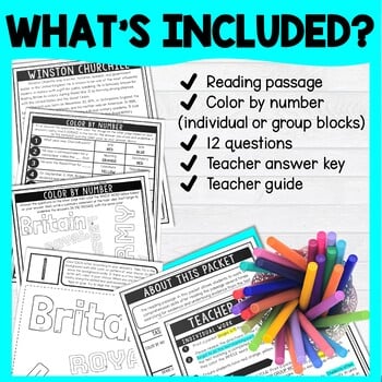 Practice reading comprehension skills with this Winston Churchill Color by Number Close Reading Activity. Students will examine the non-fiction, informational text multiple times. This activity includes TWO options for students (individual coloring page or group collaborative poster).